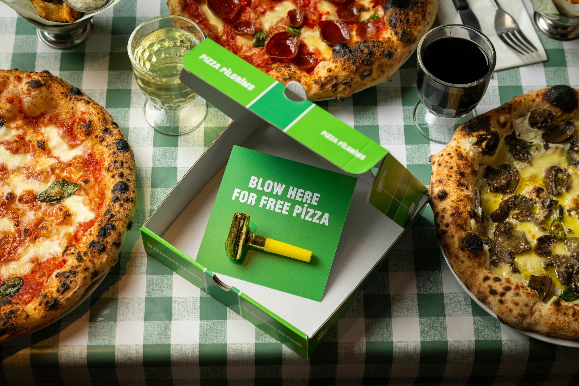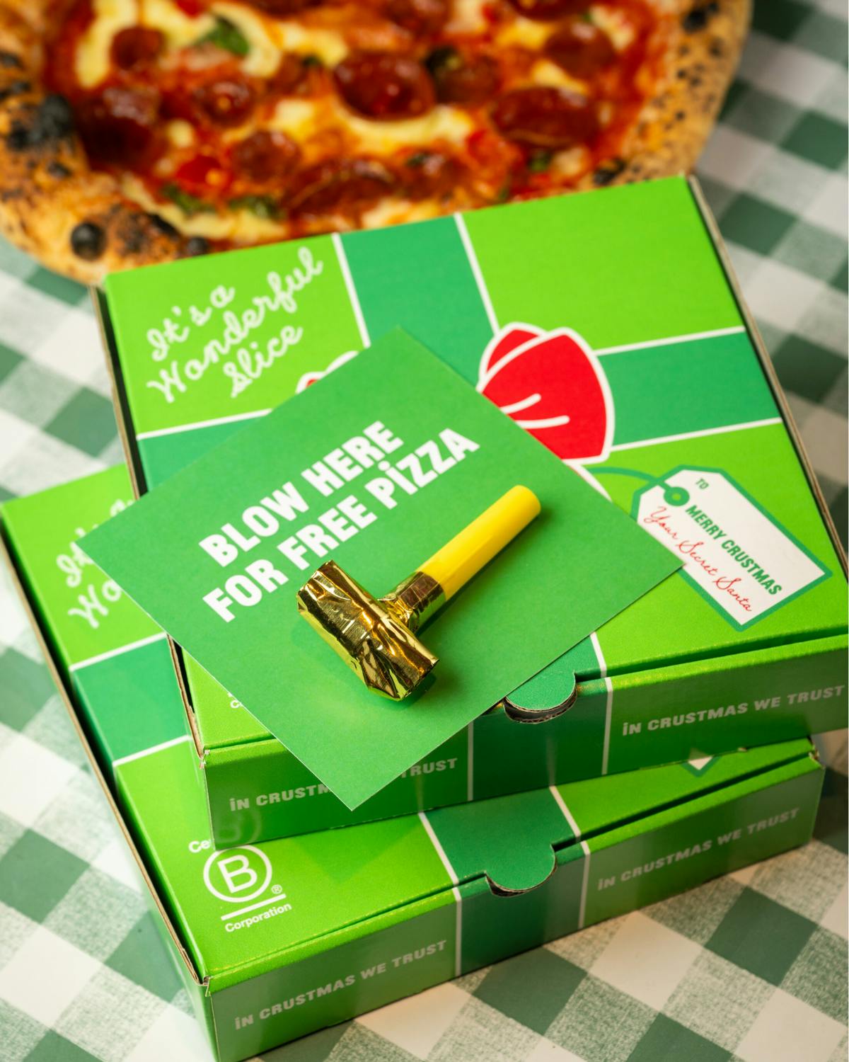Our limited-edition Christmas gift box will contain a voucher for FREE PIZZA for your gift recipient.